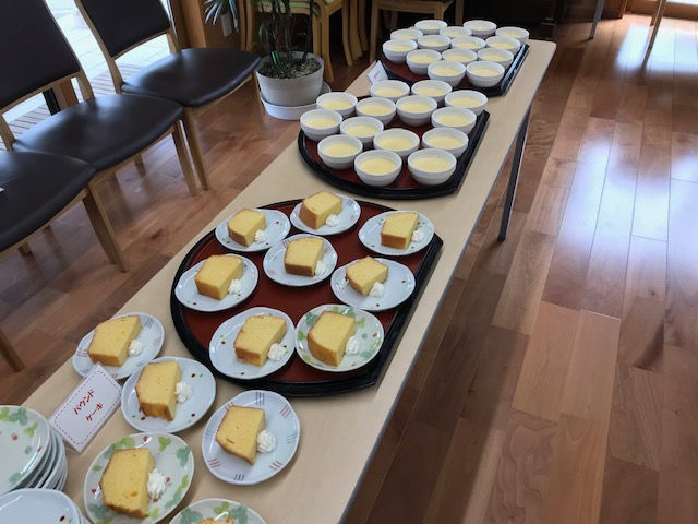 デザートの「カスタードプリン」「パウンドケーキ」「果物ジュレ」は、手作りの素朴な味で「優しい甘さで、おいしい」と喜ばれました。
