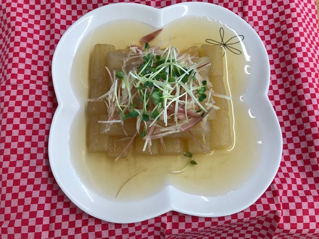 冬瓜にはたくさんの水分と共に、ミネラル類のカリウムを摂取でき、むくみ解消に効果があります。「みょうが」をのせて、さっぱりした味に仕上げました。